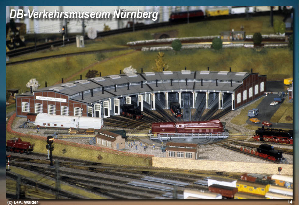 Die Modelleisenbahn im DB-Verkehrsmuseum Nürnberg ist eingebettet in das älteste Eisenbahnmuseum der Welt, dessen Ursprünge bis ins Jahr 1882 zurückreichen und das mit seinen Standorten in Nürnberg sowie den Außenstellen in Koblenz und Halle an der Saale die Geschichte der Eisenbahn in Deutschland umfassend dokumentiert. Kern des Museums bildet am Standort Nürnberg eine großflächige Ausstellung auf rund 6 800 Quadratmetern, die den Zeitraum von den frühen Anfängen der Eisenbahn um 1800 über die industrielle und technische Entwicklung bis in die Gegenwart und mit einem Ausblick in die Zukunft abdeckt. Anders als in vielen klassischen Eisenbahnmuseen steht dabei nicht allein die Technik im Vordergrund, sondern sie wird als Teil eines dichten Geflechts aus gesellschaftlichen, wirtschaftlichen und kulturellen Zusammenhängen vermittelt, wodurch die Eisenbahn als prägendes System für Mobilität und Entwicklung verständlich wird. Zahlreiche interaktive Exponate, die von Originalfahrzeugen über technische Bauteile bis hin zu Alltags- und Werbeobjekten reichen, machen diese Zusammenhänge anschaulich und lebendig. Einen besonderen Anziehungspunkt bilden die Originalfahrzeuge, von denen rund vierzig Exemplare in zwei Hallen präsentiert werden, darunter Deutschlands ältester erhaltener Personenwagen, ein Nachbau des legendären Adlers als erster Dampflokomotive auf deutschem Boden sowie moderne Entwürfe wie das Designmodell des ICE 4. Innerhalb dieses musealen Gesamtkonzepts nimmt die Modelleisenbahnanlage im ersten Stock des Museums eine besondere Rolle ein und zählt seit Jahren zu den beliebtesten Attraktionen bei Besuchern aller Altersgruppen. Auf einer Fläche von etwa 80 Quadratmetern erstreckt sich ein fein ausgearbeitetes Streckennetz mit rund 500 Metern Gleislänge, auf dem gleichzeitig etwa dreißig Züge verkehren und ein abwechslungsreicher, realitätsnaher Betrieb gezeigt wird. Im Maßstab 1 : 87 werden unterschiedliche Zugarten dargestellt, darunter ICE-Triebzüge, klassische D-Züge, Reisezugwagen verschiedener Epochen sowie Dampfloks, Diesel- und Elektrolokomotiven in wechselnden Garnituren. Die Züge bewegen sich über Steigungs- und Gefällestrecken, durch Tunnel und über Brücken, halten an Bahnhöfen und durchfahren Knotenpunkte, wodurch typische Betriebsabläufe des Eisenbahnalltags im Miniaturformat nachvollziehbar werden. Gesteuert wird der Verkehr von einem diensthabenden Fahrdienstleiter, der den Betrieb von einem originalen Gleisbildstellwerk aus überwacht und lenkt und dabei realistischen Zug- und Rangierbetrieb demonstriert. Für die Besucher wird so anschaulich, wie Streckenblöcke funktionieren, wie Zugfolgen gesichert werden und wie im Rangierbahnhof Güterzüge neu zusammengestellt werden. Ergänzt wird das Erlebnis durch moderne Videotechnik, die den Betrieb aus unterschiedlichen Perspektiven zeigt und Details sichtbar macht, die dem bloßen Auge sonst entgehen würden. Insgesamt verbindet die Modelleisenbahn im DB-Verkehrsmuseum Nürnberg technische Präzision, didaktische Vermittlung und anschaulichen Fahrbetrieb zu einer kompakten Darstellung der Eisenbahnwelt, die das große Vorbild in konzentrierter Form erlebbar macht. (c)WV