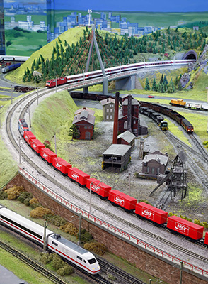 Auf dem Gleisnetz von mehr als 1500 m Länge sind computergesteuert ständig Lokomotiven und Wagen aus allen Epochen der Eisenbahngeschichte unterwegs.